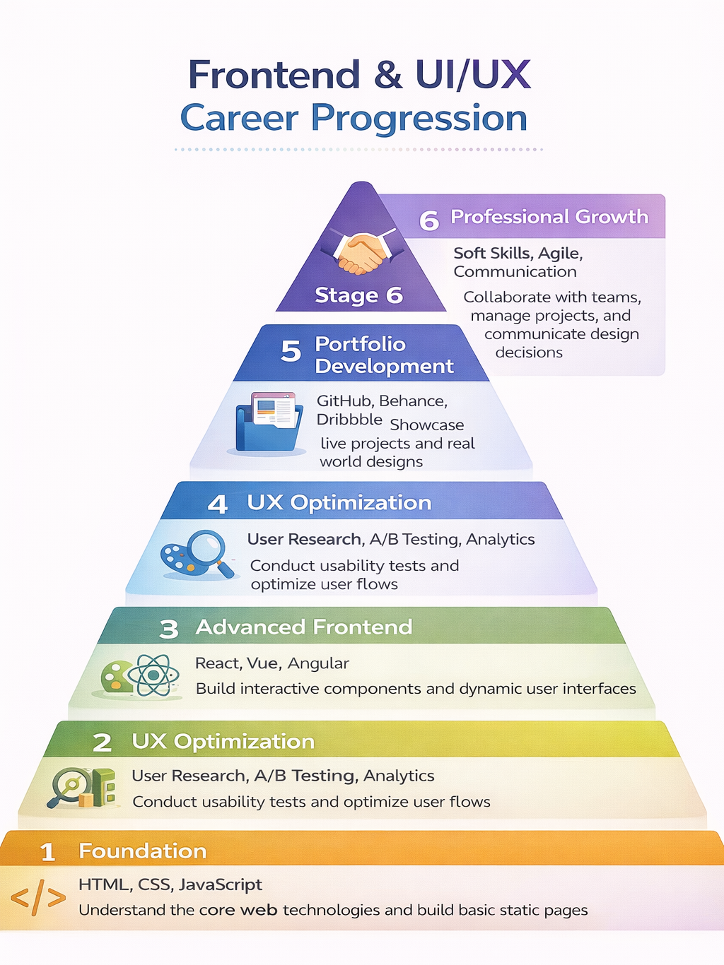 Infographic Idea: A pyramid diagram showing the stages from Foundation → Professional Growth, visually representing progression.