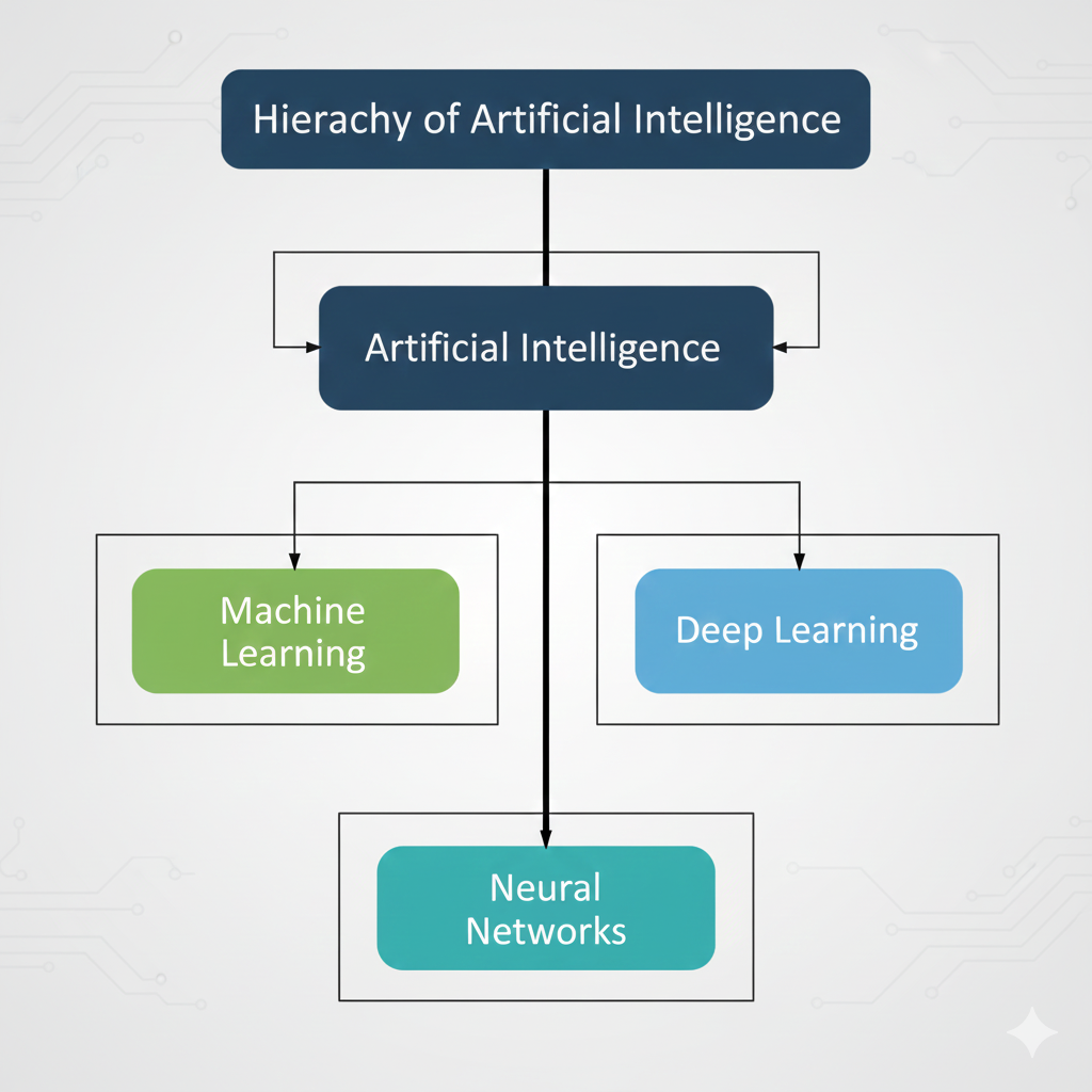 - Deep Learning: A subset of ML that uses multi-layered neural networks for highly complex tasks.