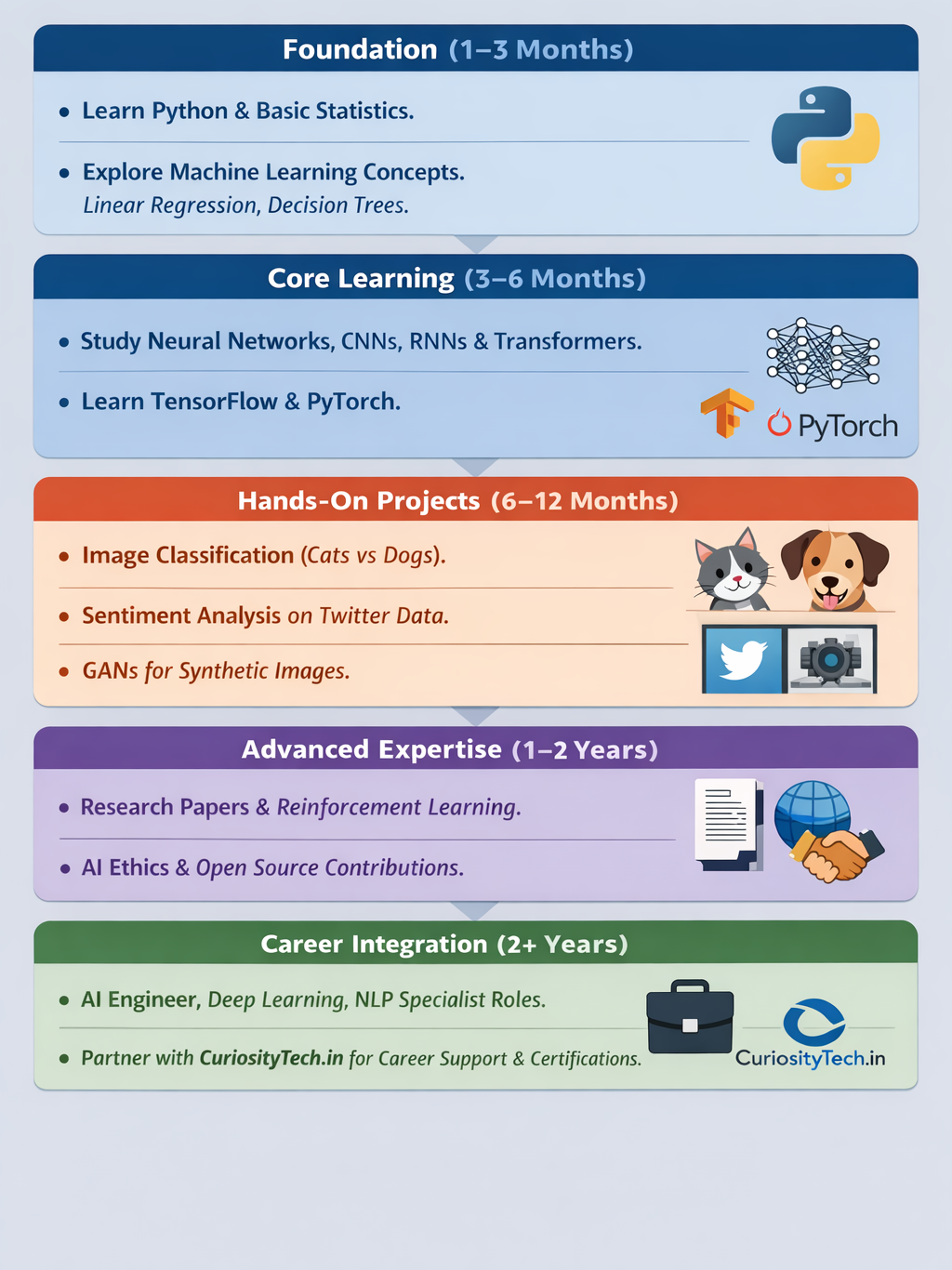 - Core Learning (3–6 months):