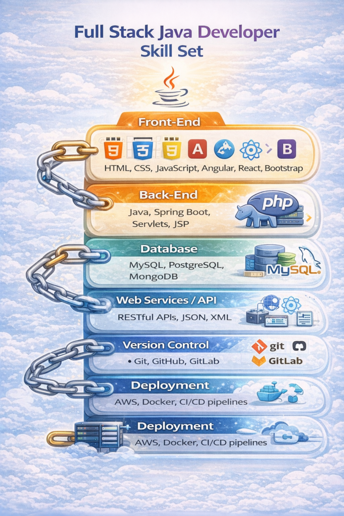Here’s a hierarchical breakdown of a typical Full Stack Java Developer’s skill set: