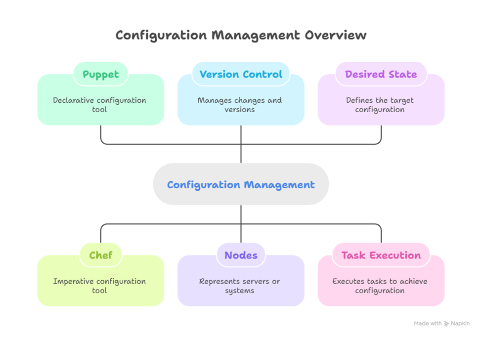 Configuration management is the practice of automating system setup, application installation, and environment configuration so that servers and services remain consistent across all environments. CM ensures: