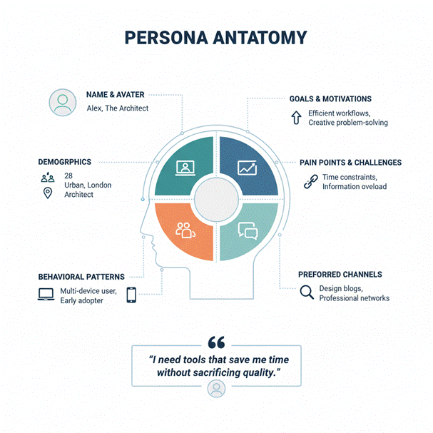 - Name & Photo: Humanizes the persona.