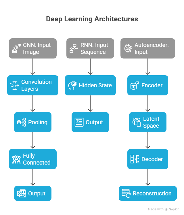 Convolutional Neural Network (CNN) | Handles grid-like data (images) | Image recognition, object detection |