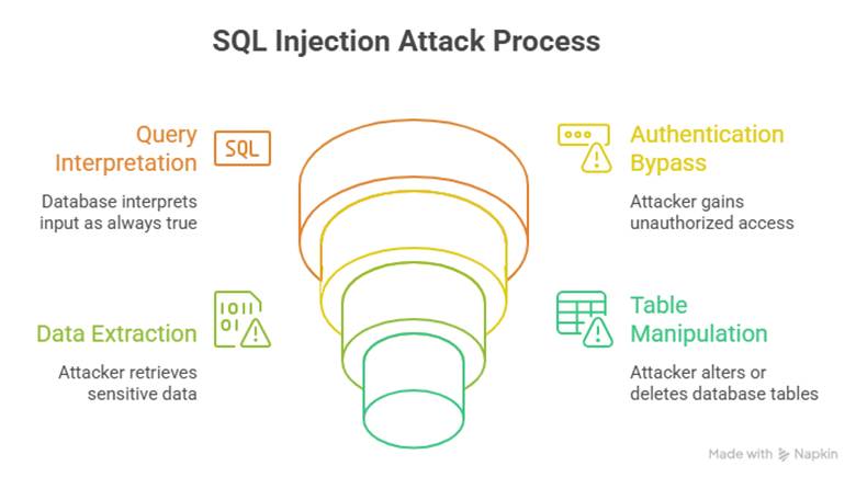 - Attacker extracts data (SELECT * FROM users;) or drops tables (DROP TABLE users;).