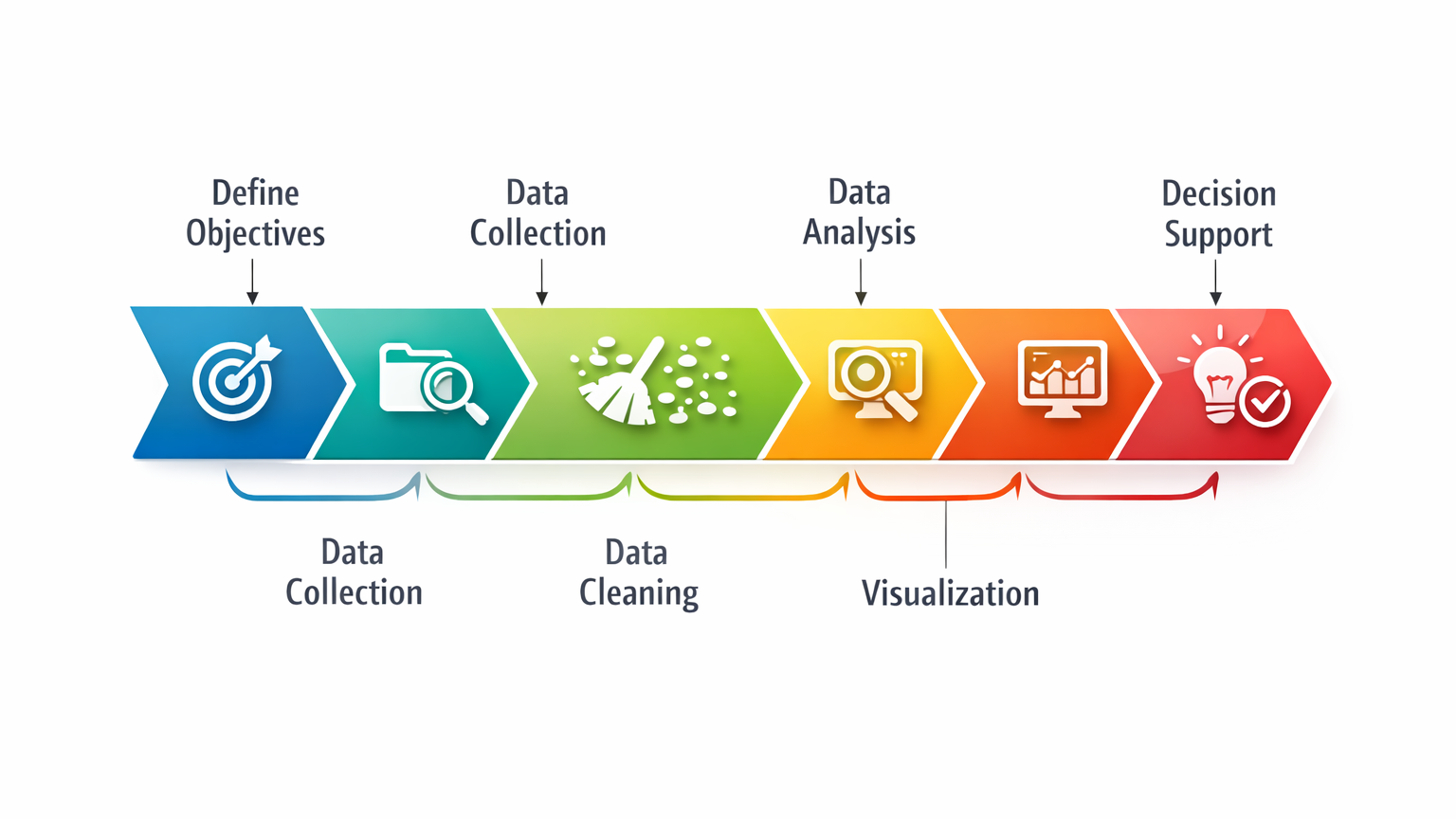 Define Objectives –> Data Collection –> Data Cleaning –> Data Analysis –> Visualization –> Decision Support