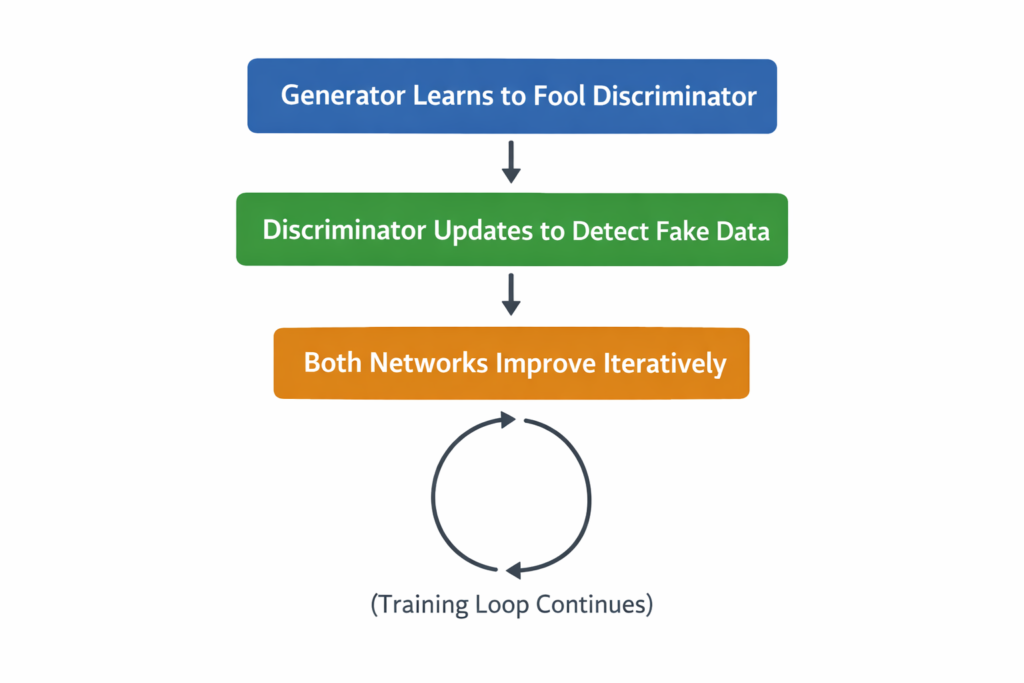 3 . Generator learns to fool Discriminator → Both networks improve iteratively