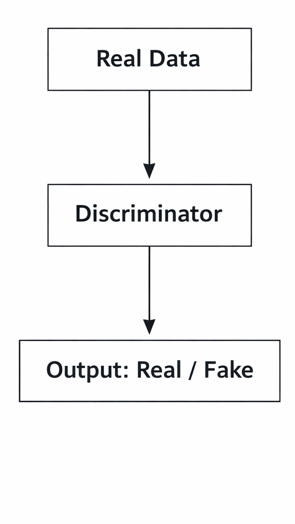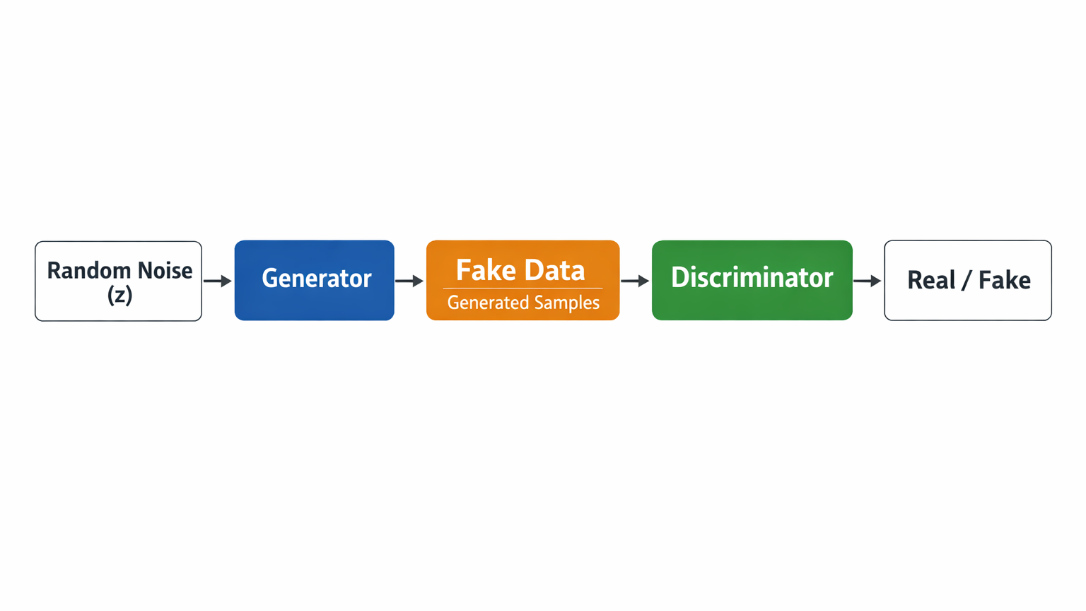 1 . Random Noise → Generator → Fake Data → Discriminator → Real/Fake