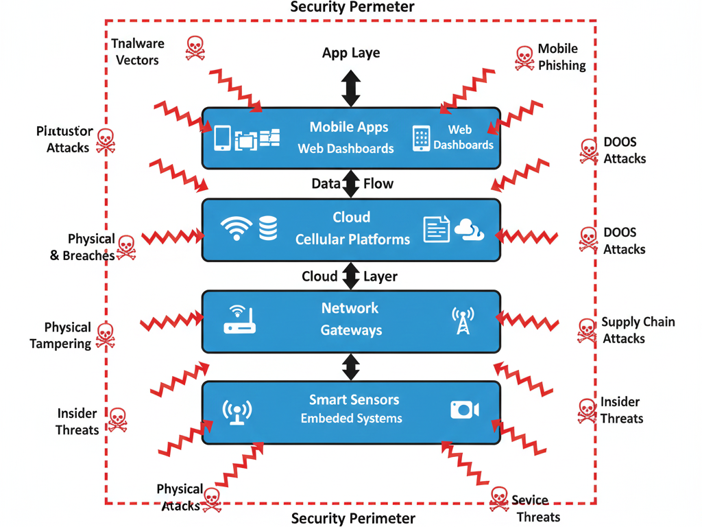 Picture IoT ecosystem layers (Device → Network → Cloud → App). Threat vectors point inward from all sides: