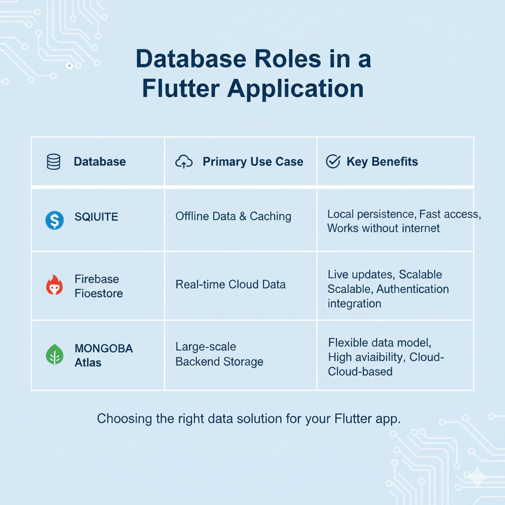 In cross-platform mobile development, developers usually work with three powerful data systems: SQLite for local storage, Firebase for real-time cloud data, and MongoDB for large scalable backends.