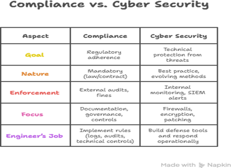 Engineer’s Job | Implement rules (logs, audits, technical controls). | Build defense tools and respond operationally. |