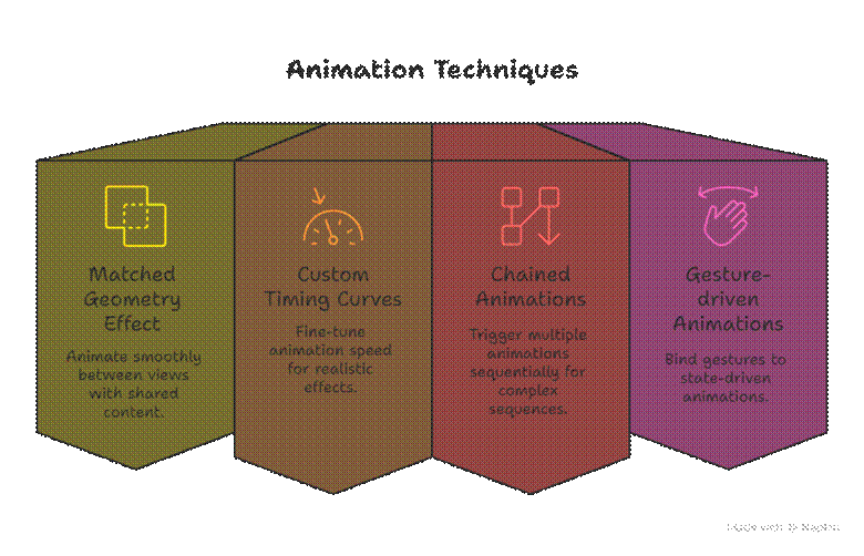 - Implicit Animations: SwiftUI automatically animates changes to properties when wrapped in .animation().