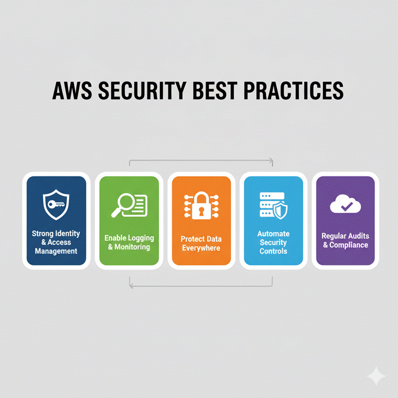 Enable CloudTrail & Security Hub | Detect anomalies and maintain compliance |