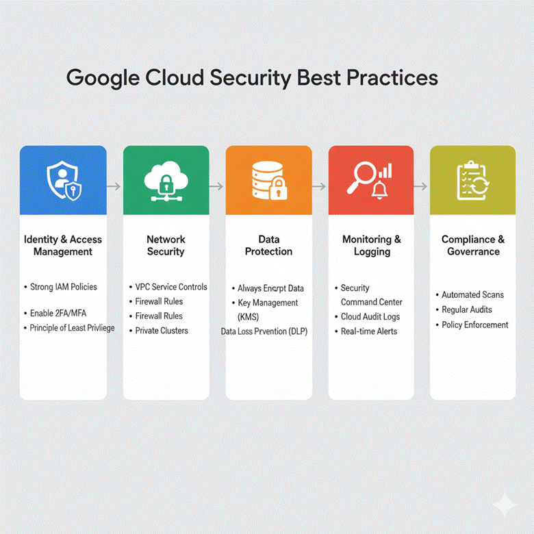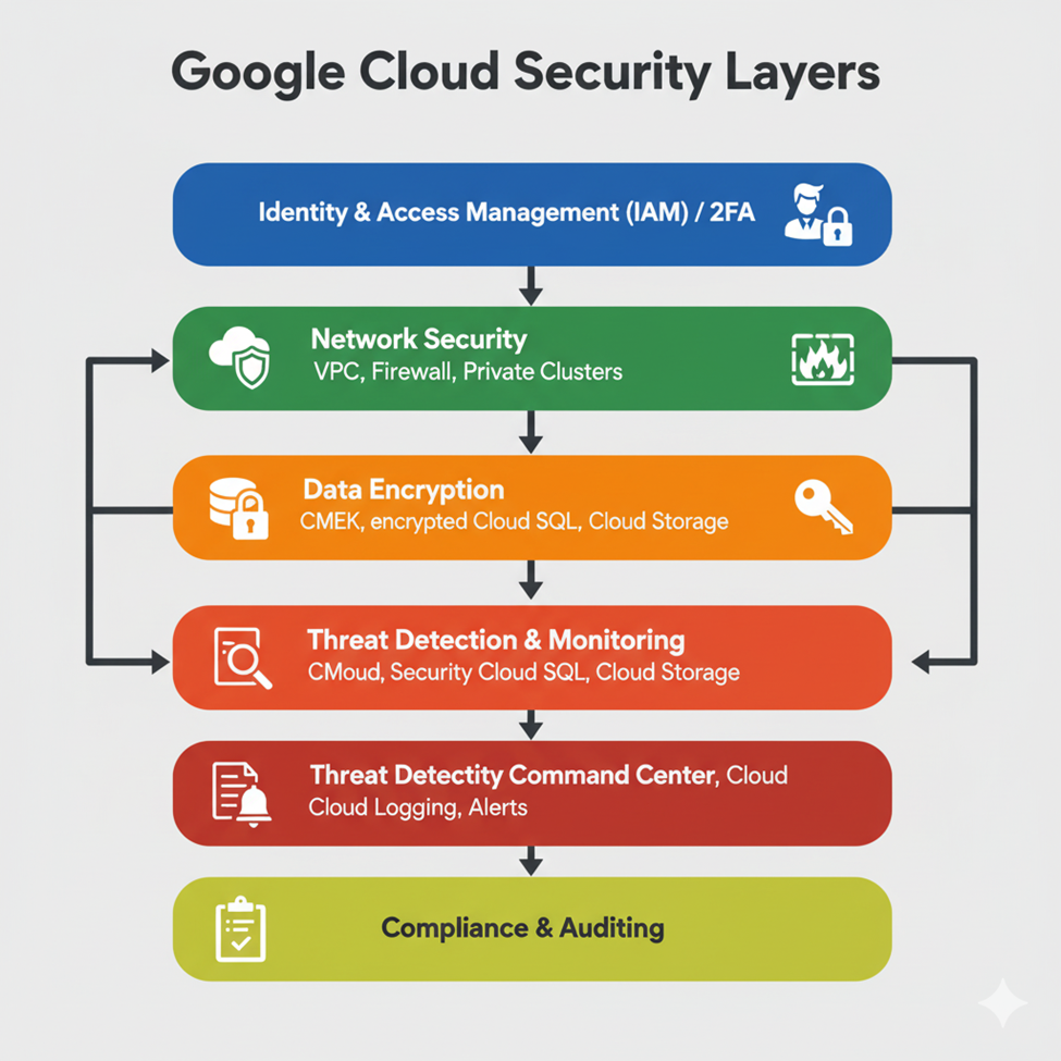 Mastering Google Cloud Security is critical for any cloud engineer. By implementing IAM best practices, data encryption, network security, monitoring, and compliance controls, engineers can ensure applications are secure, resilient, and compliant.