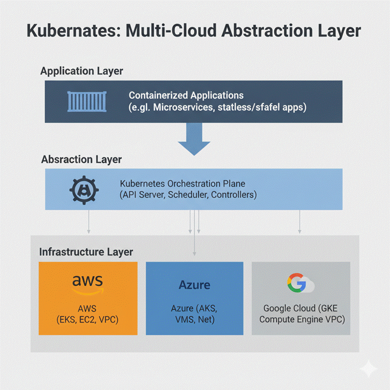 Kubernetes (K8s) is the key — it acts as a common control system that hides cloud differences.