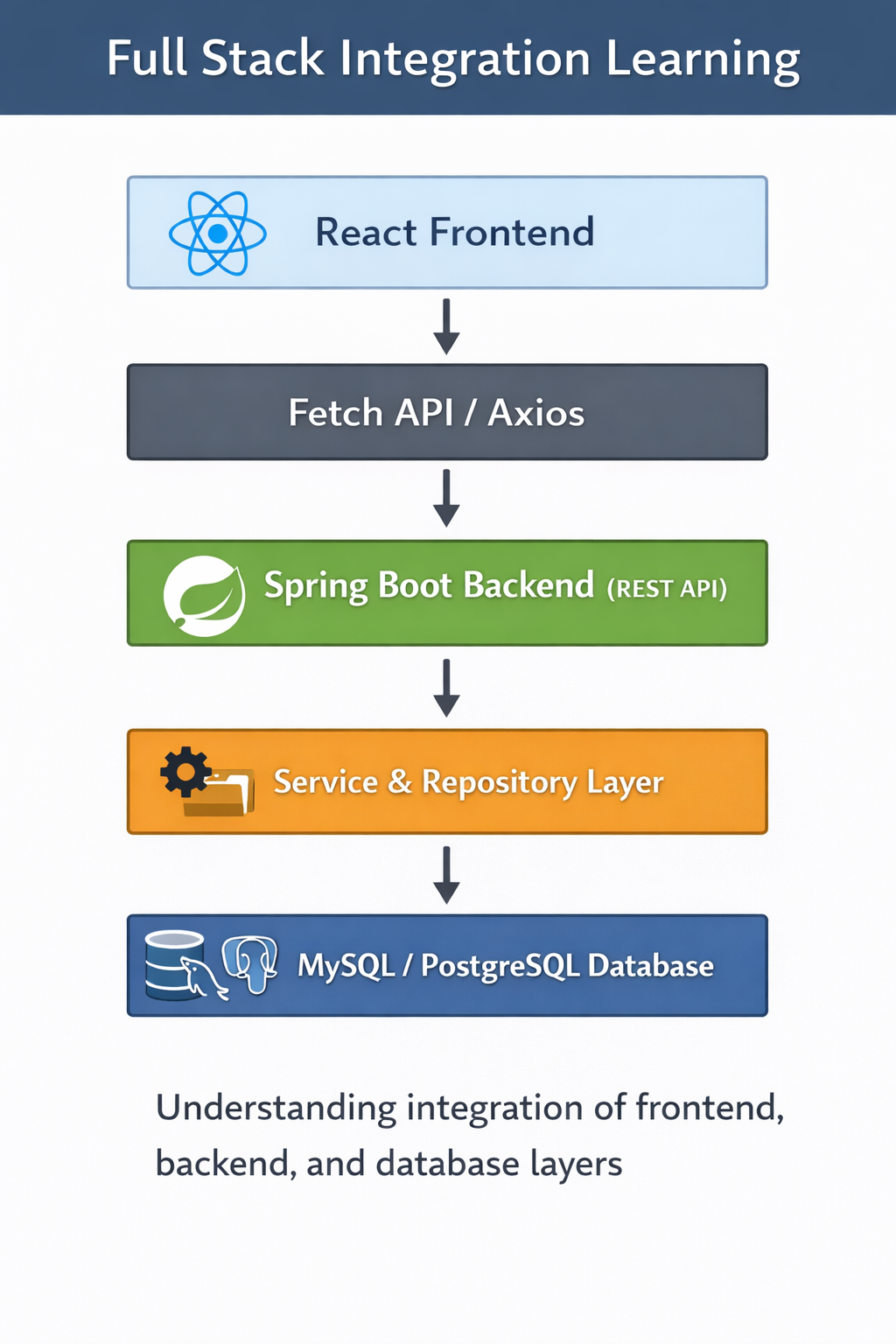 Description: React sends HTTP requests to Spring Boot REST APIs. The backend processes requests, interacts with the database, and responds with JSON, which React renders dynamically.