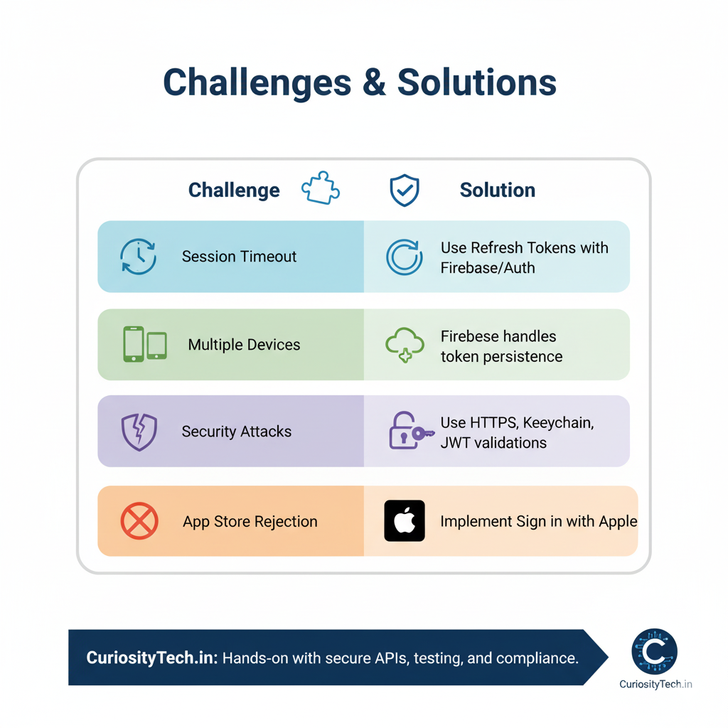 Security Attacks | Token theft, replay attacks | Use HTTPS, Keychain, JWT validations |