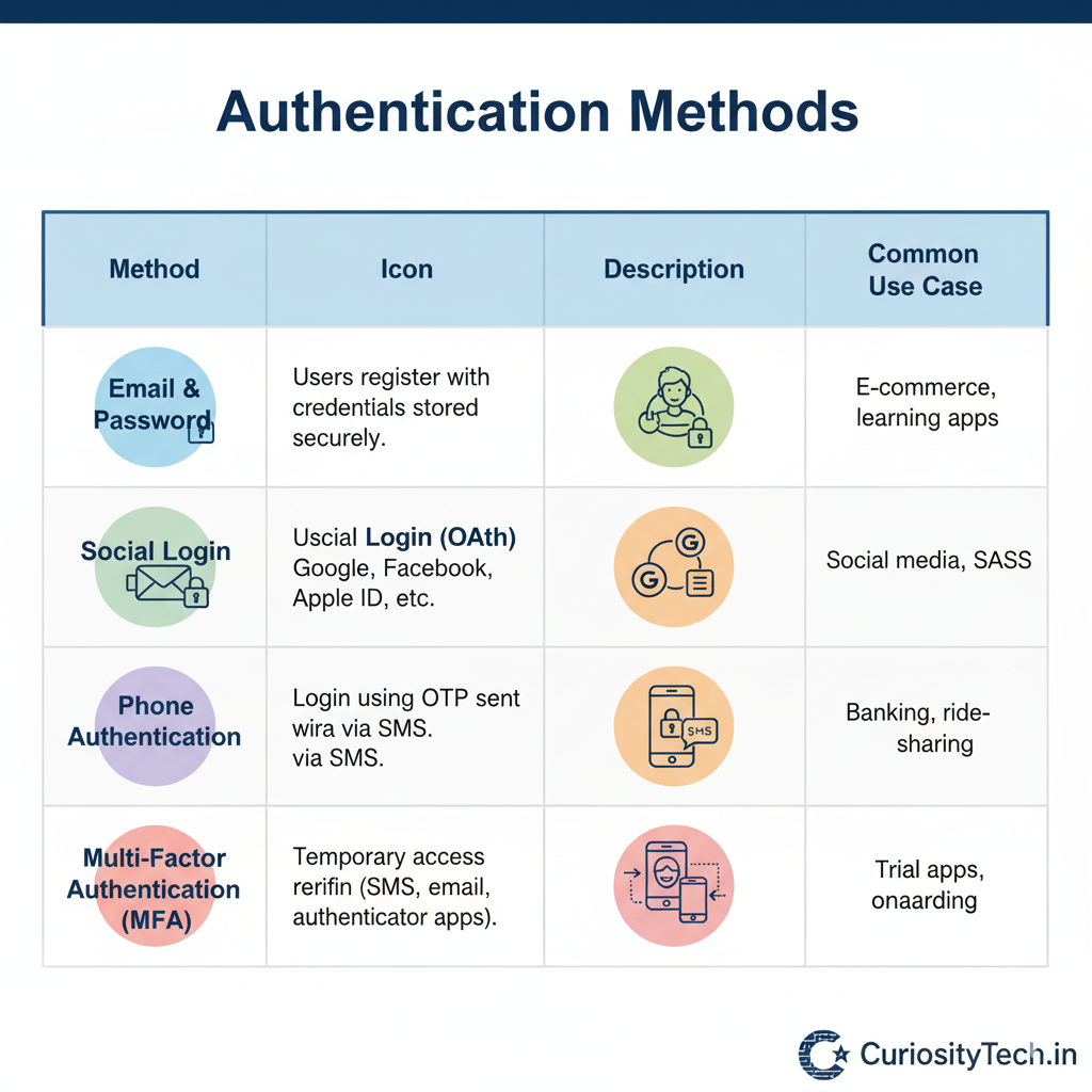 Email & Password | Users register with credentials stored securely in Firebase/Auth server | E-commerce, learning apps |