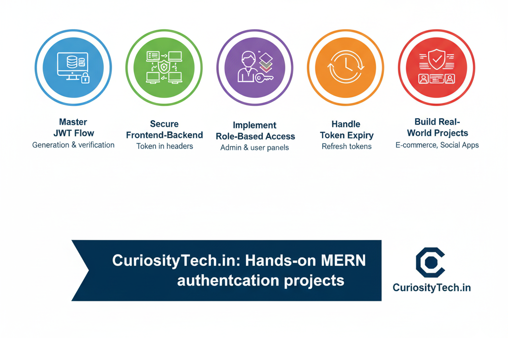 JWT-based authentication is a cornerstone for secure MERN applications. Mastering token generation, verification, route protection, and frontend integration equips developers to build production-ready, secure, and scalable applications. CuriosityTech.in provides hands-on projects to implement JWT effectively, preparing learners for professional full-stack development.