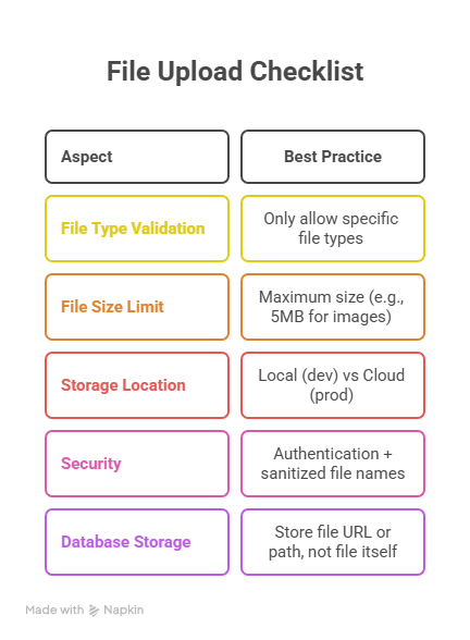 - Secure Uploads: Protect endpoints with authentication middleware to prevent unauthorized access.