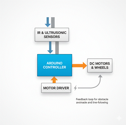[IR & Ultrasonic Sensors] → [Arduino Controller] → [Motor Driver] → [DC Motors & Wheels]
