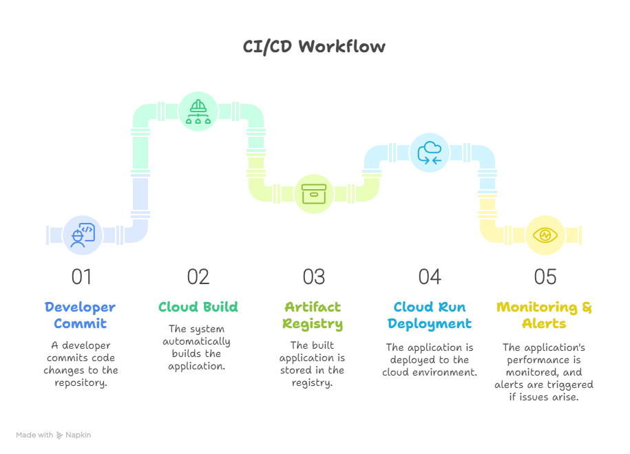 | Cloud Monitoring | Monitors pipeline performance and deployment success metrics. |