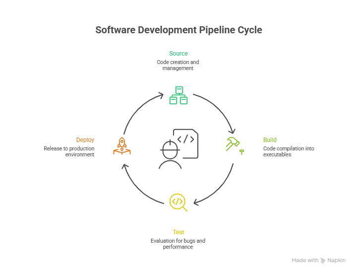 A linear pipeline flowing from Source → Build → Test → Deploy.