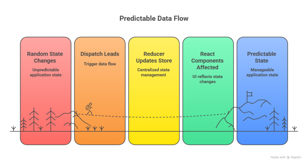 Buttons stop responding correctly, data appears in the wrong place, and bugs become unpredictable. This is where Redux becomes essential. It brings order, structure, and predictability to large-scale React applications.