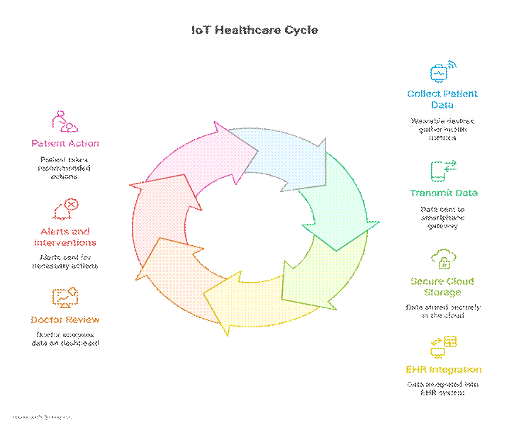 - She wakes up, her IoT smartwatch automatically syncs her overnight heart rate variability and SpO₂ levels to a cloud dashboard.