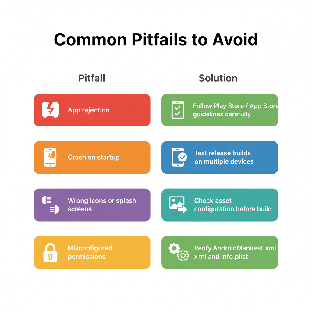 - Configure AndroidManifest.xml for Android and Info.plist for iOS with correct app icons, permissions, and splash screens.