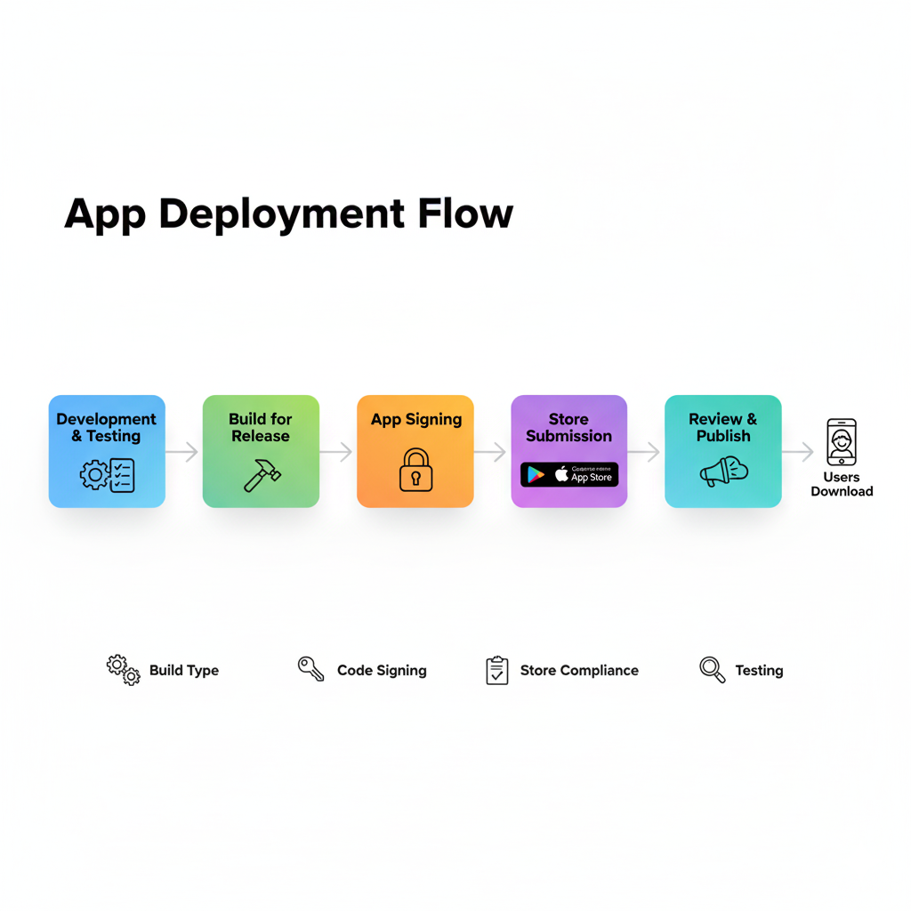 [Development & Testing] -> [Build for Release] -> [App Signing] -> [Store Submission] -> [Review & Publish] -> [Users Download]