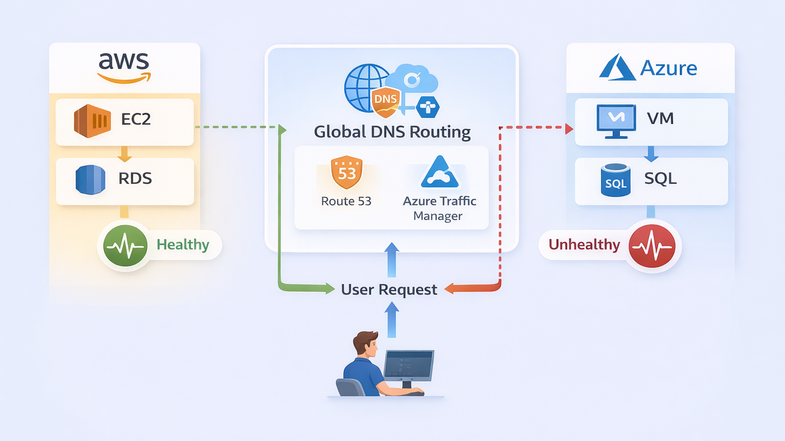 - Center: Global DNS (Route 53 + Azure Traffic Manager).