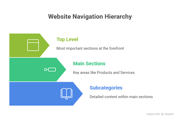 Description: This structure ensures the most important sections (Products, Services, Contact) are visible at the top level, while subcategories allow deeper navigation without cluttering the interface. Users can intuitively drill down to find their desired content without feeling lost.