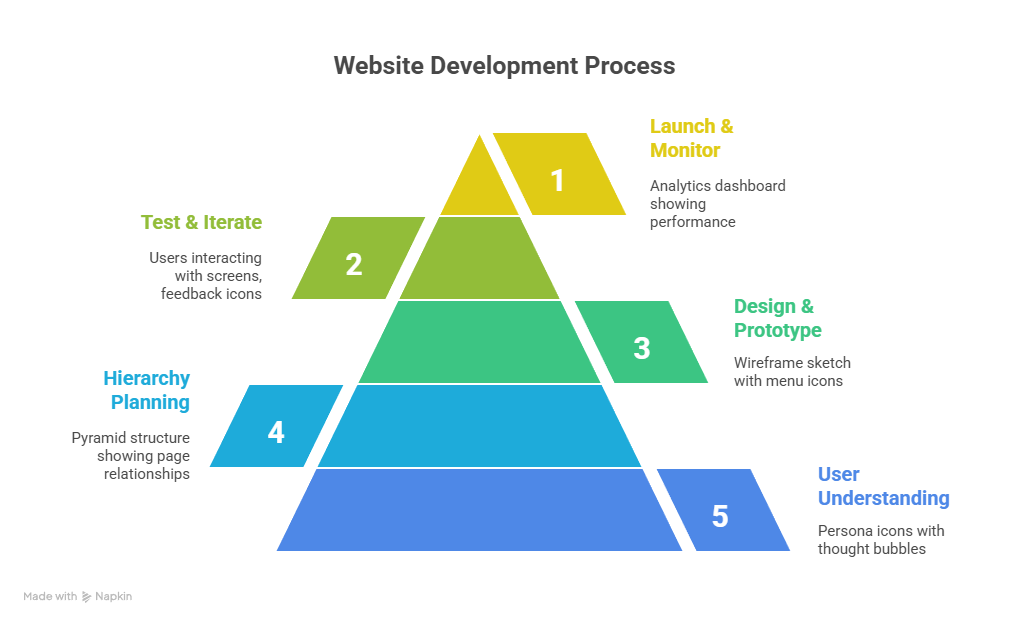 Description: This infographic communicates navigation design visually, helping teams and stakeholders understand the workflow from conceptualization to implementation.