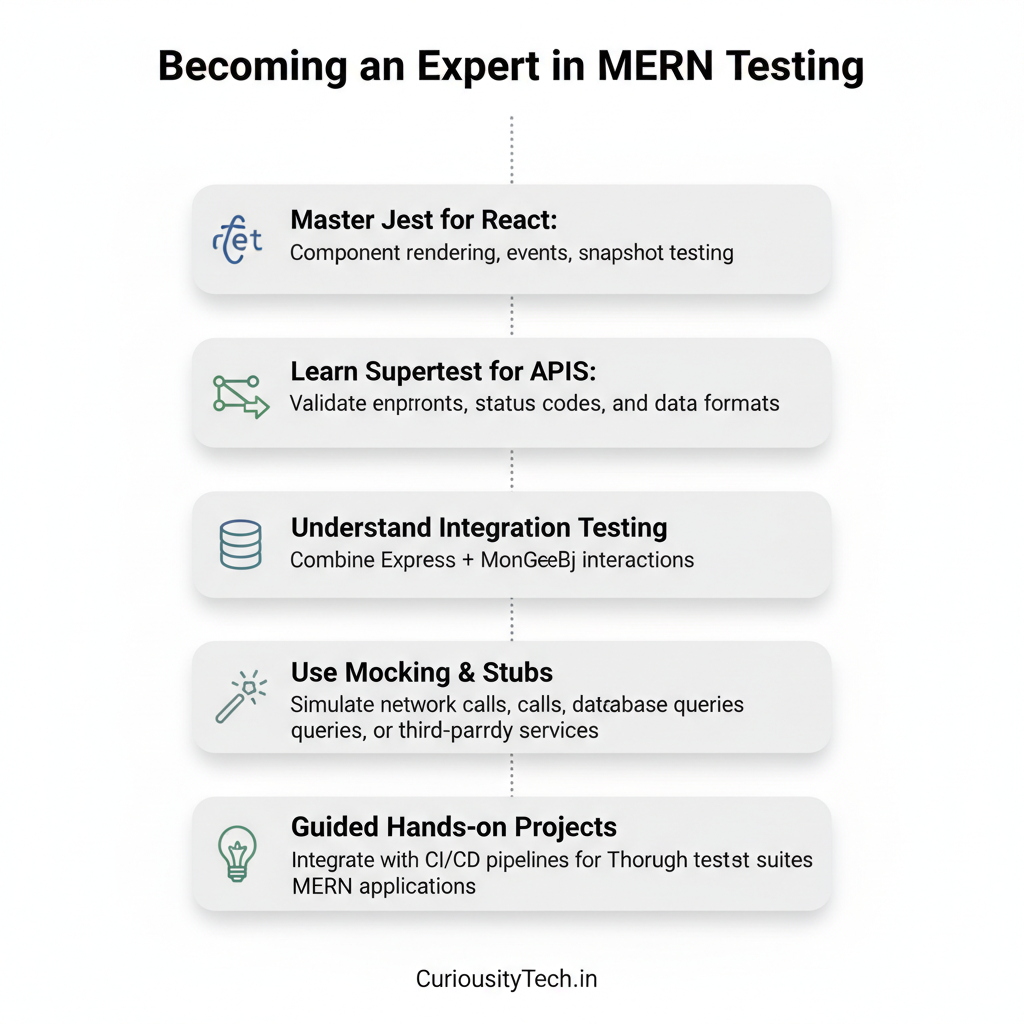 Testing is essential for building professional, bug-free MERN applications. Mastering unit tests, integration tests, and API tests ensures reliability and maintainability. CuriosityTech.in guides learners through hands-on testing projects, making them confident in delivering production-ready full-stack applications.