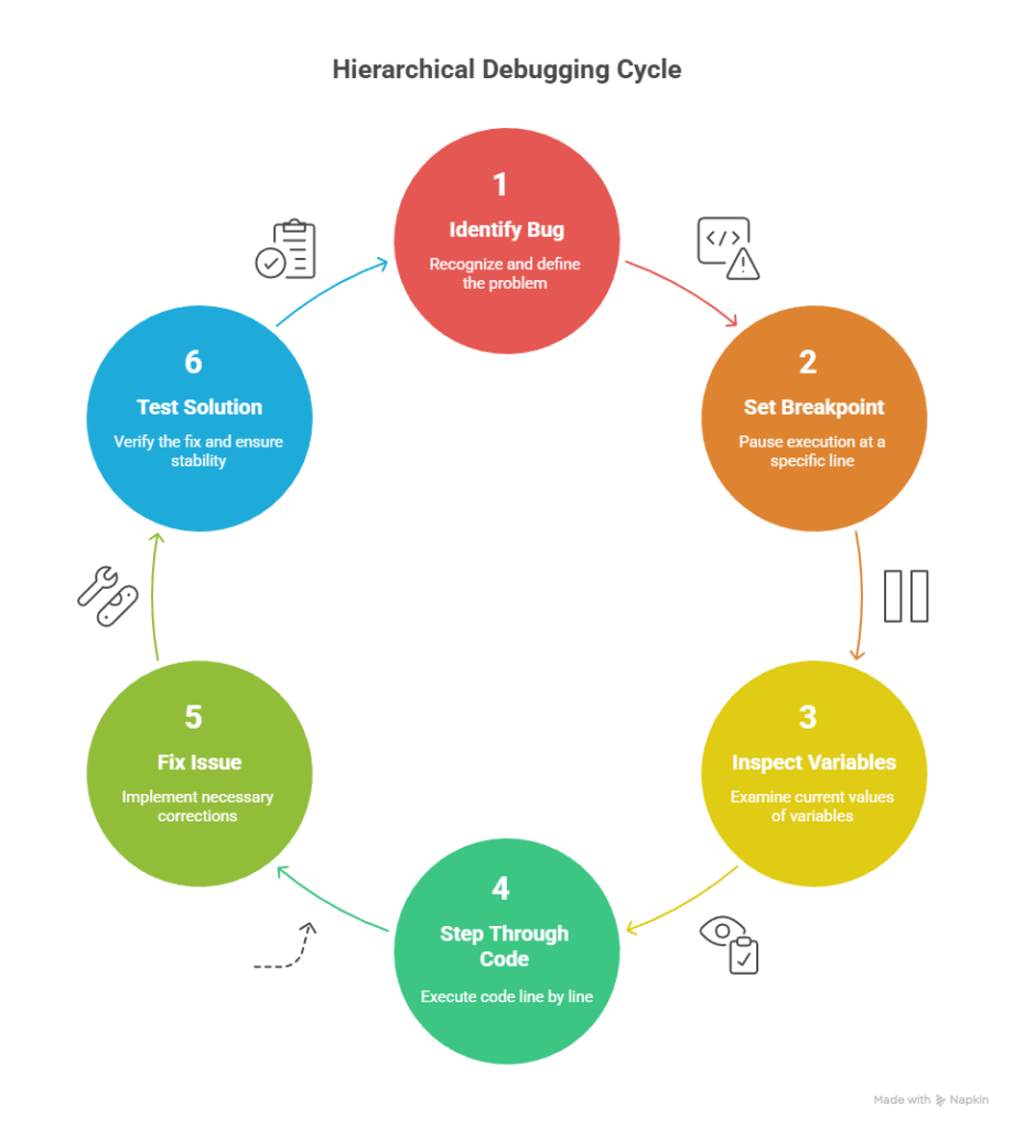 Debugging is the process of finding, analyzing, and fixing issues in your code. Let’s break it down: