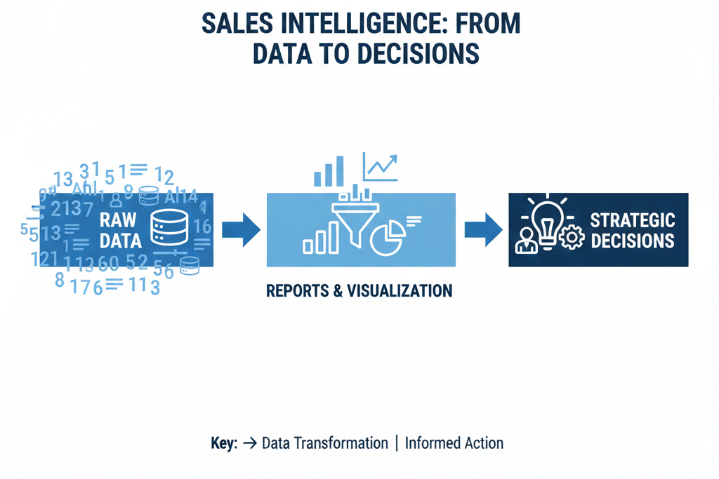 A visual showing raw sales data being converted into charts and graphs that guide business decisions.