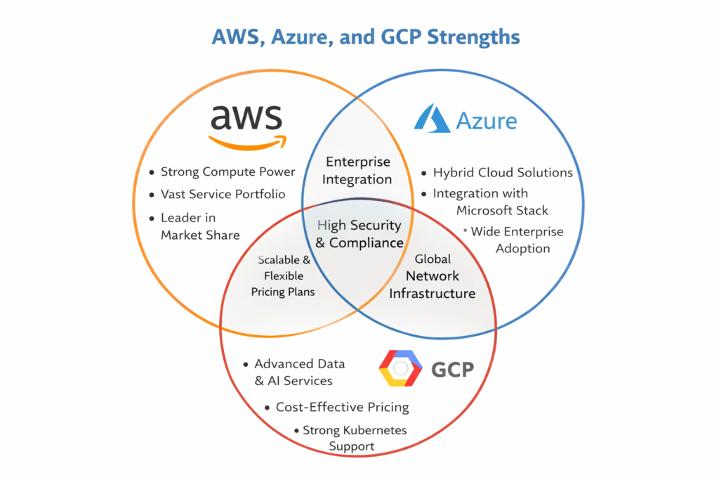 A Venn diagram showing overlapping and unique strengths of AWS, Azure, and GCP.