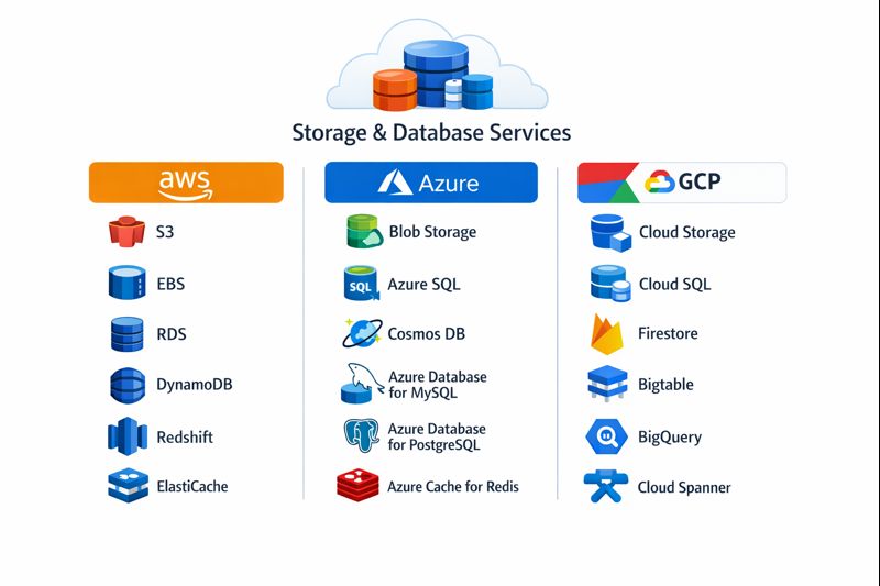 - Azure: Blob storage for unstructured data, Managed Disks, and SQL Database for relational storage.