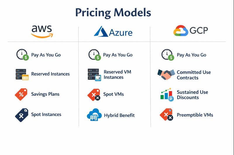 - AWS: Pay-as-you-go, Reserved Instances, Savings Plans.