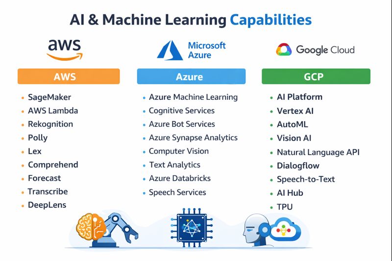 - Azure: Azure ML, Cognitive Services for vision, speech, and language.