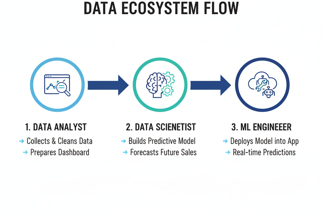 When people hear the terms Data Scientist, Data Analyst, and Machine Learning Engineer, they often assume they mean the same role. But in reality, these are distinct professions—each critical in the journey from raw data to business insights and AI-driven products.