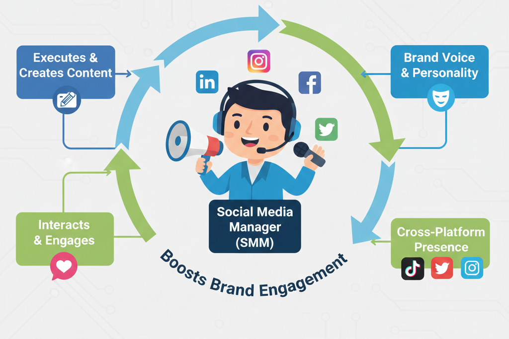 A Social Media Manager (SMM) is the voice and personality of the brand online. While the DMM sets strategy, the SMM executes, interacts, and ensures engagement across platforms like Instagram, LinkedIn, Facebook, Twitter, and TikTok.