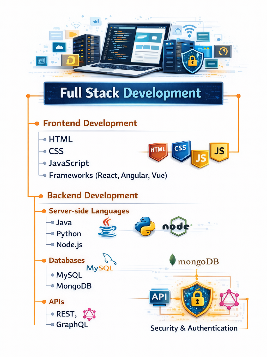 A Full Stack Developer combines both worlds—capable of crafting elegant frontends while engineering robust backends.