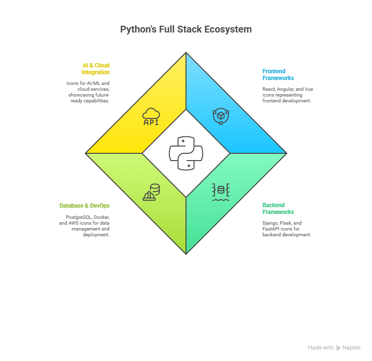 This hierarchy shows how Python neatly fits into every layer of a full stack architecture, giving developers end-to-end control.