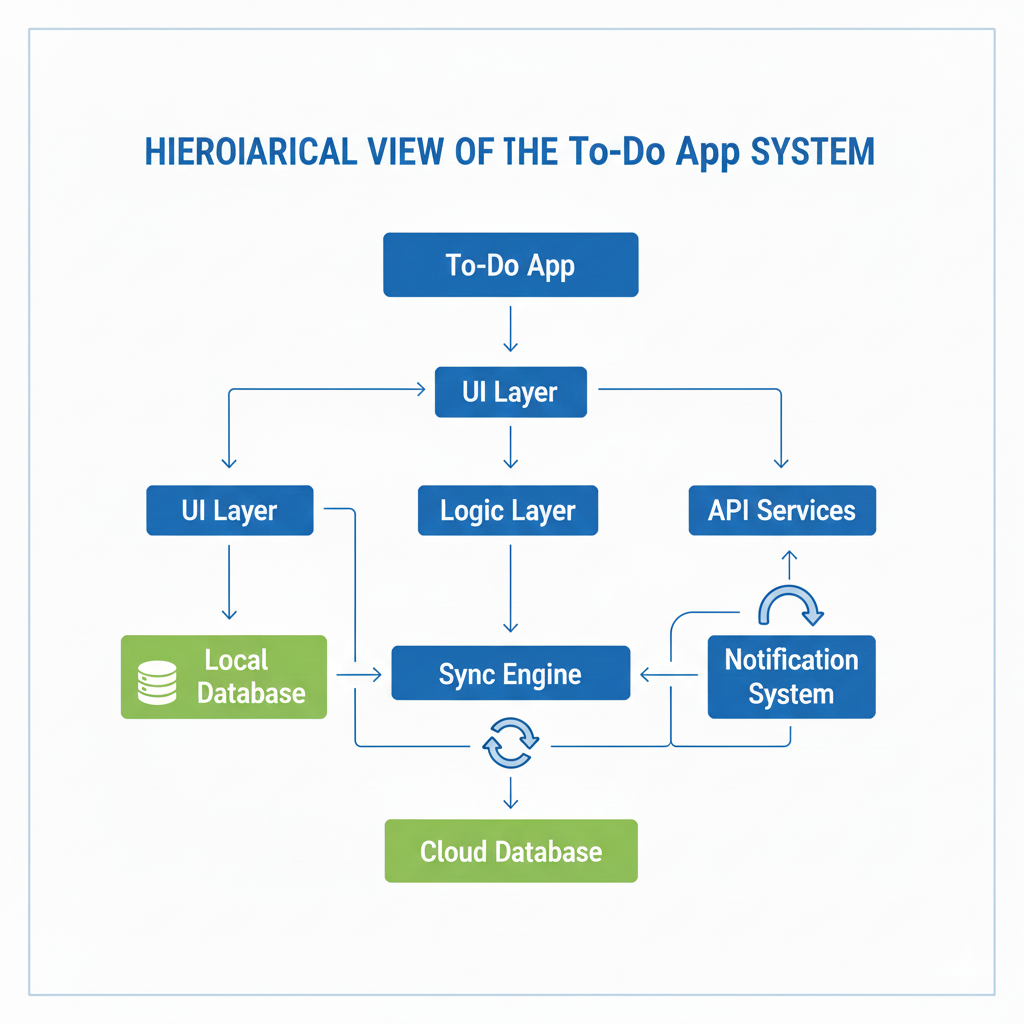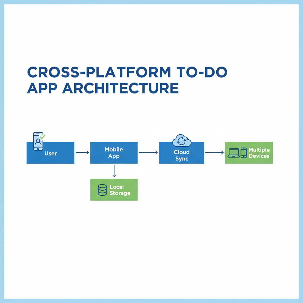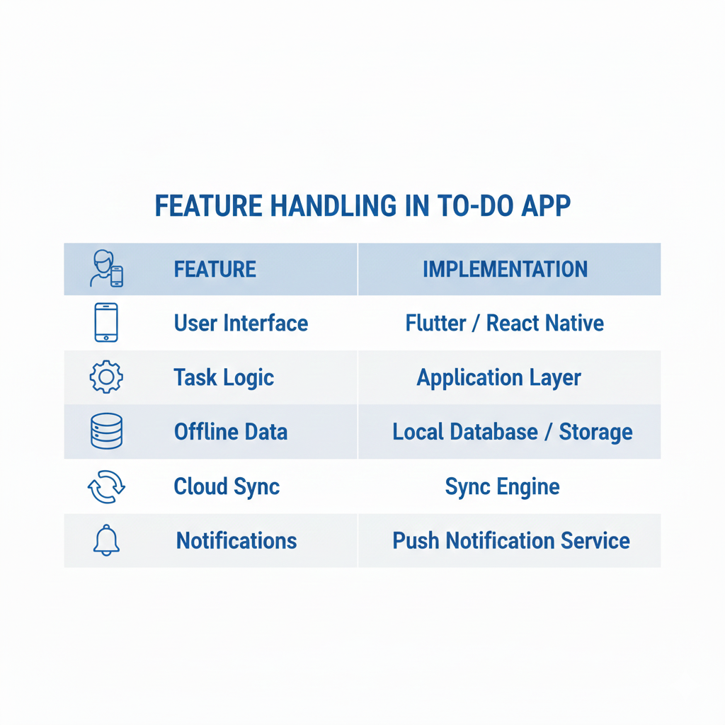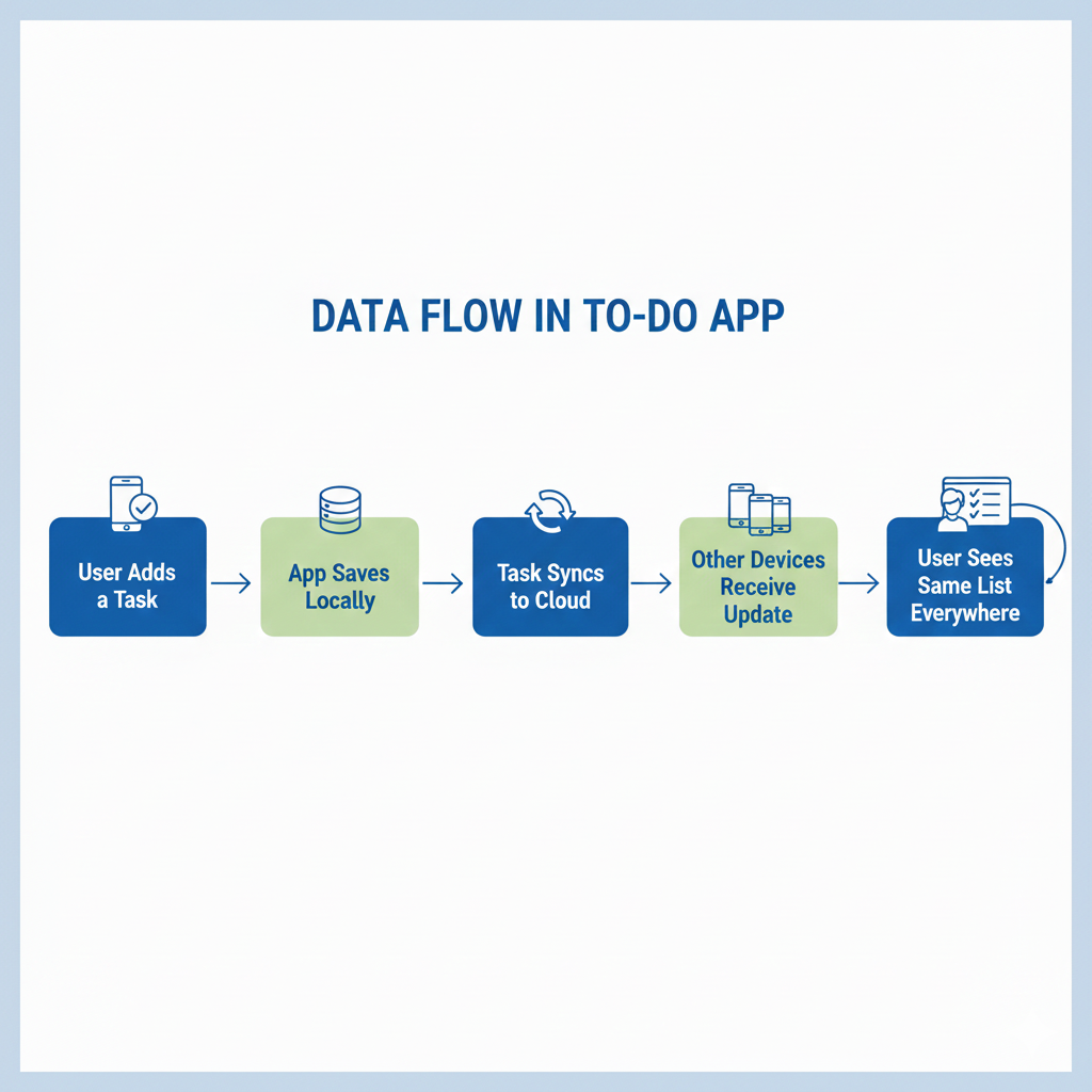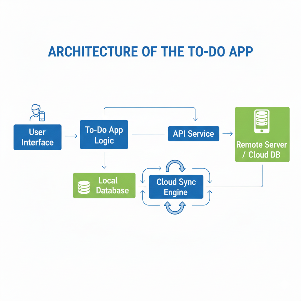 The app is divided into layers. The interface is built with Flutter widgets or React Native components. The business logic manages task creation, updates, and deletions. The data layer stores tasks locally and synchronizes them with the cloud.