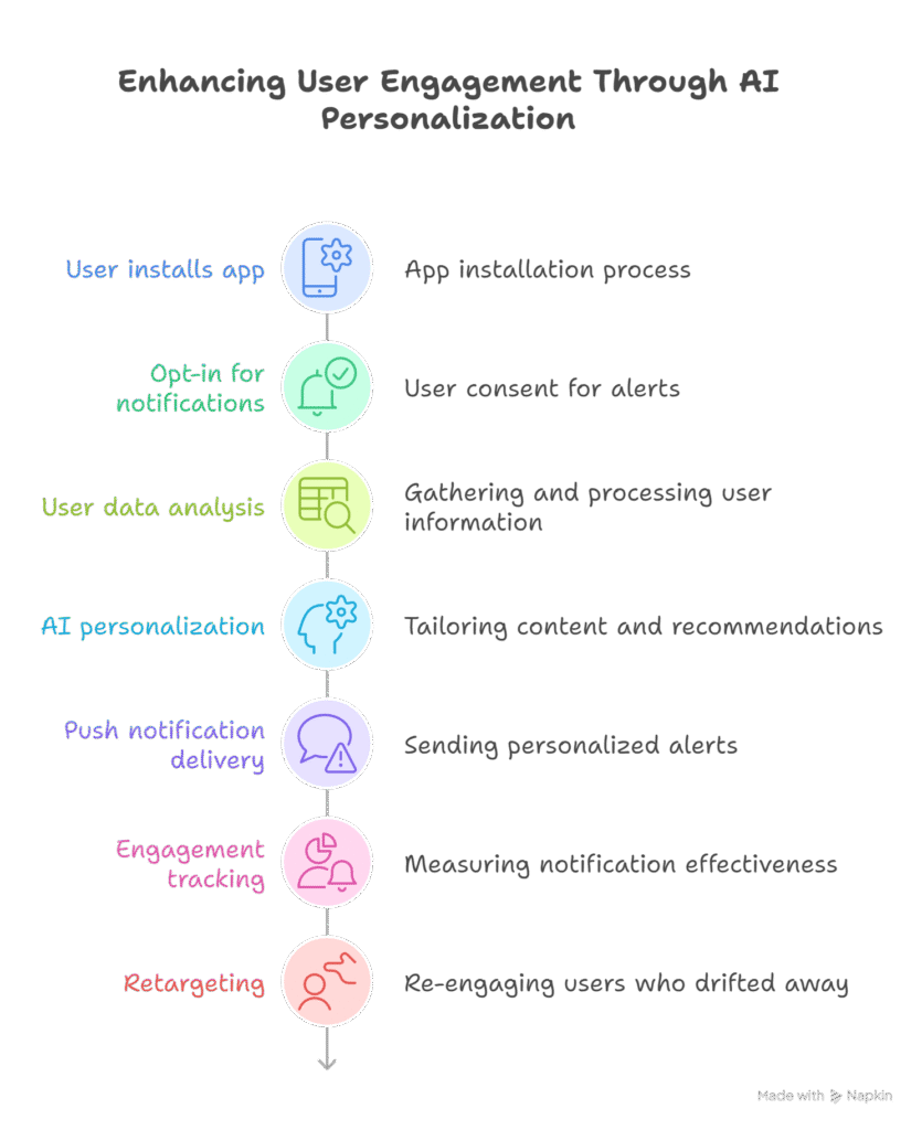 AI-driven recommendations are based on past purchases, browsing behavior, and location. Example: Push notifications offering “Discount on your favorite product” improve click-through and conversion rates.