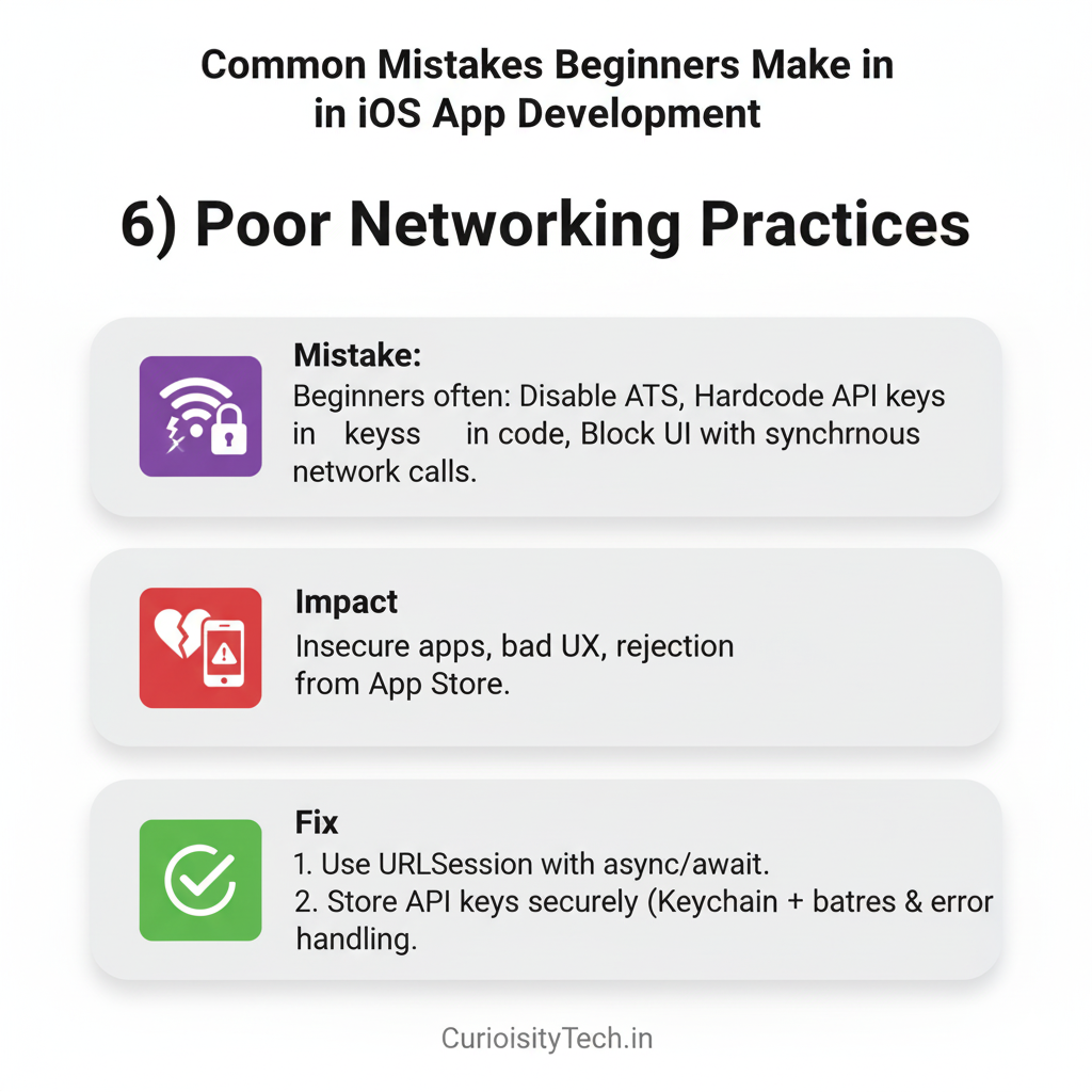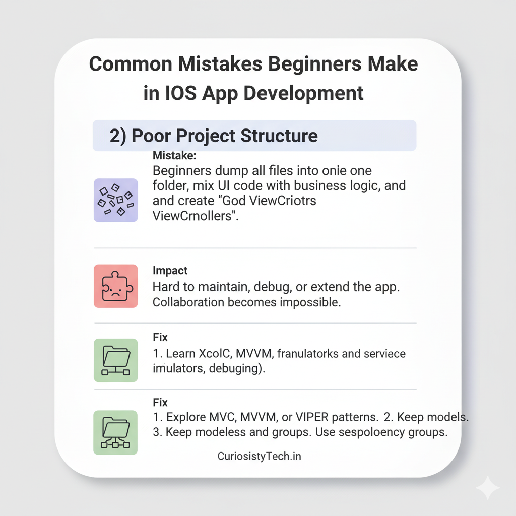 - Mistake: Beginners dump all files into one folder, mix UI code with business logic, and create “God ViewControllers” with thousands of lines.