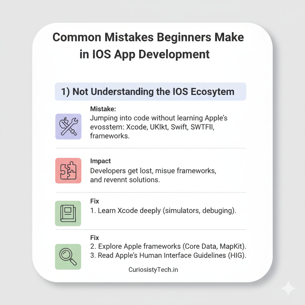 - Mistake: Jumping into code without learning Apple’s ecosystem: Xcode, Interface Builder, Swift, SwiftUI, UIKit, frameworks (Core Data, AVKit, MapKit).