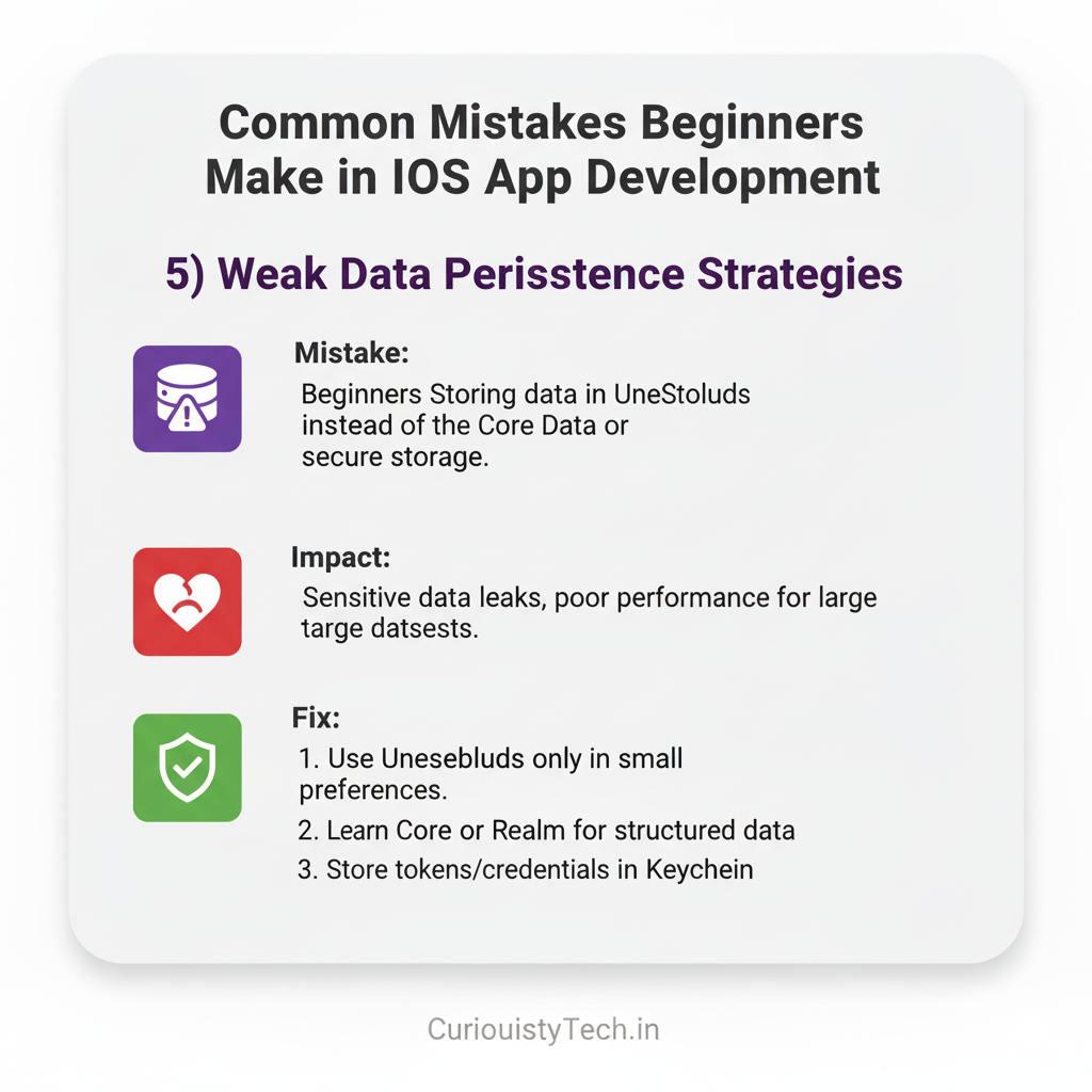 - Mistake: Storing data in UserDefaults instead of Core Data or secure storage.