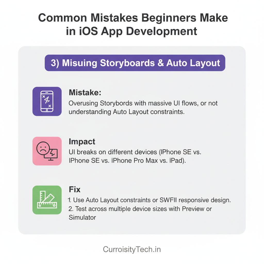 - Mistake: Overusing Storyboards with massive UI flows, or not understanding Auto Layout constraints. Beginners often rely on “magic numbers” or hardcoded frames.